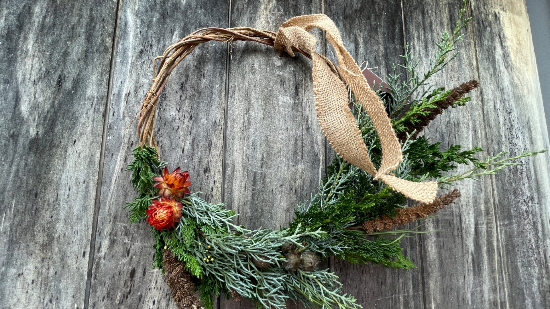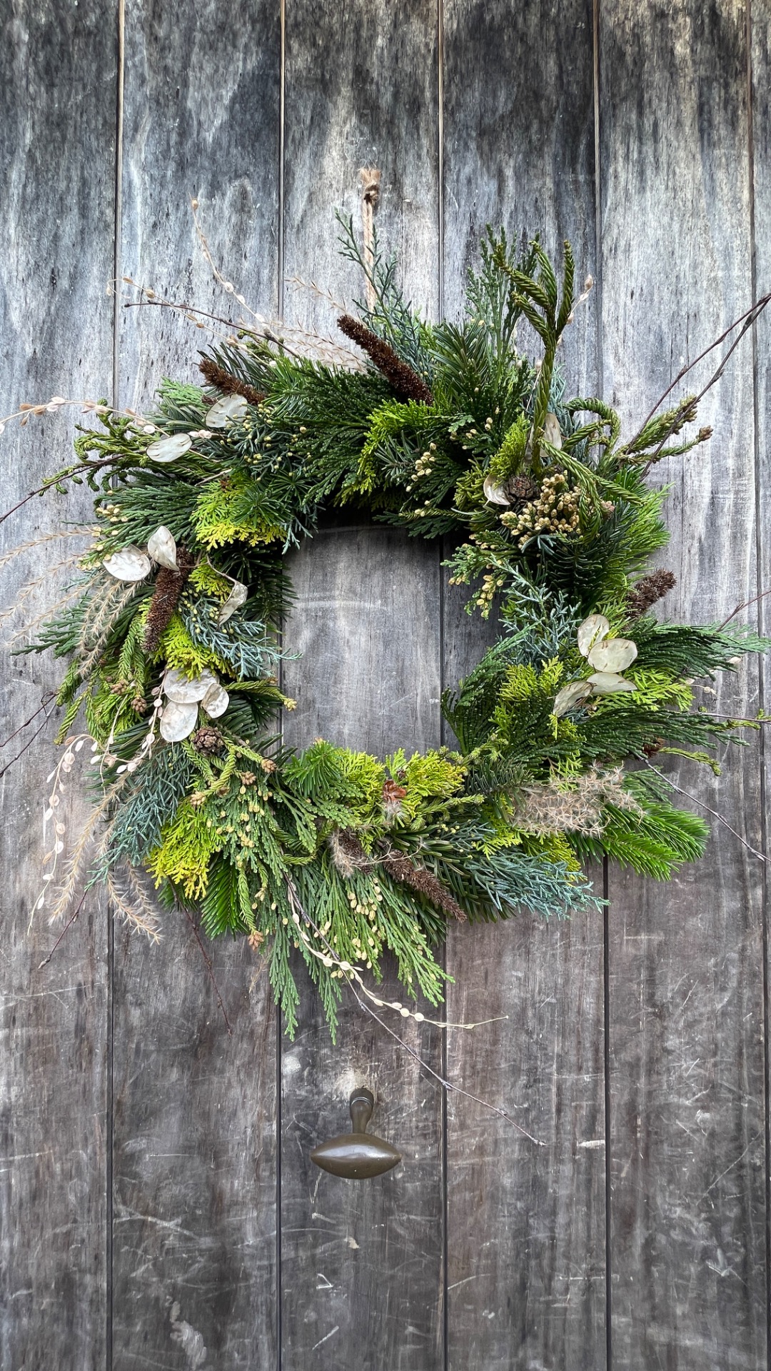 Ik maak voor jou een gezellige krans met wintergroen, bessen en bottels, aangevuld met droogbloemen, grassen en zaaddoosjes van op het veld die gedurende de zomer gedroogd werden, voor op te hangen aan de voordeur, binnen aan de muur een plaatsje te geven of op tafel te leggen
